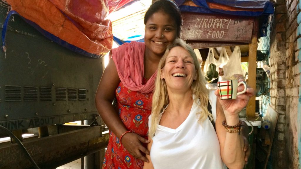 Ik slenter langs de kraampjes. Op een kruispunt sta ik stil. Ik ben verdwaald. Een hese stem: “Hello lady, you look for something?” Twee ogen kijken me aan. Een kleine ronde vrouw, haar handen beschilderd met henna, pakt mijn arm beet. “You lost, my friend?” Ik schud schaapachtig mijn hoofd. “You no worry. Come, Sita give you tea. Then Sita help you home!” Even later zit ik, samen met een vrolijke bende nieuwsgierige vrouwen op een kleedje midden op de stoep, boven een kopje thee.