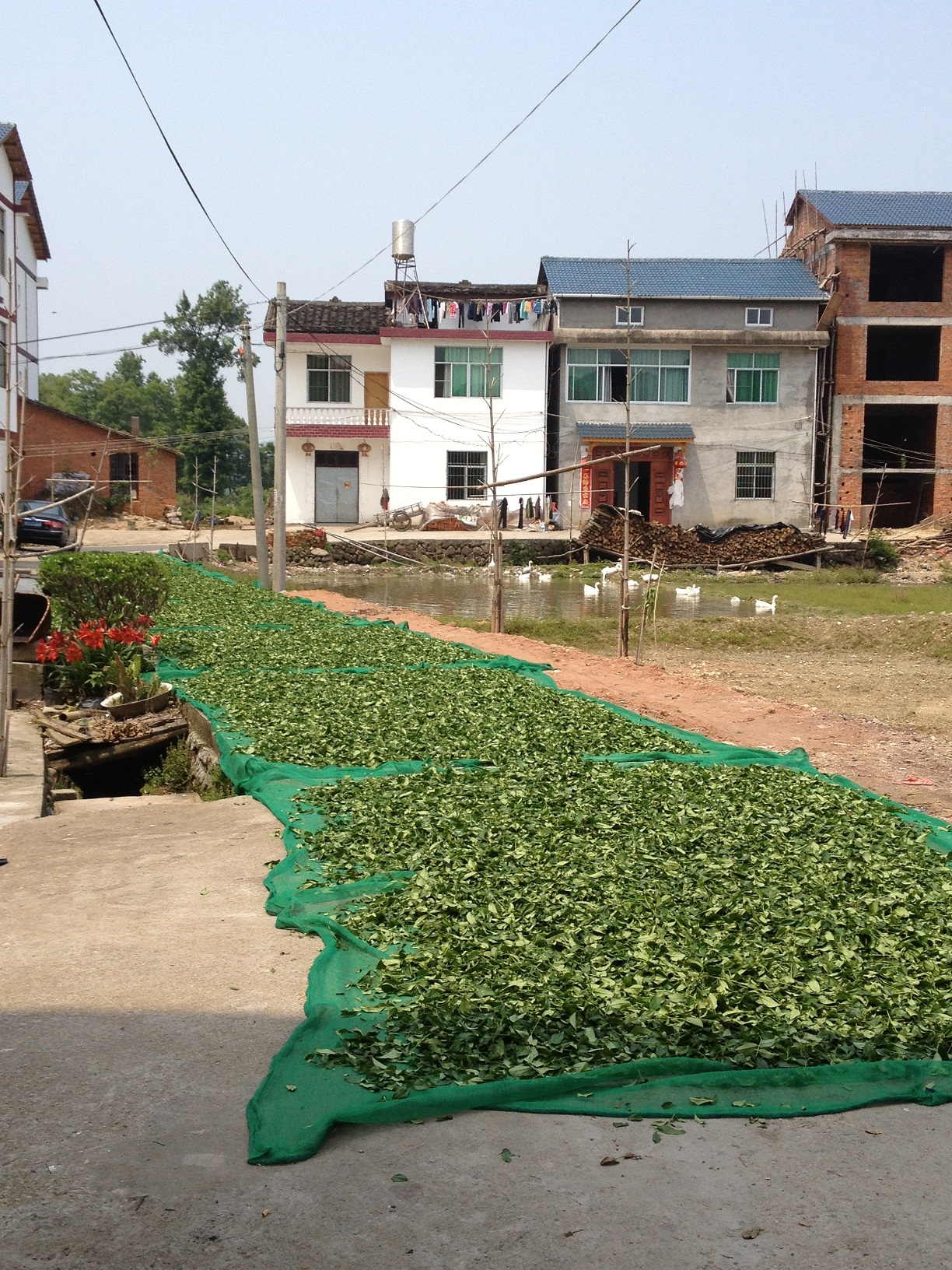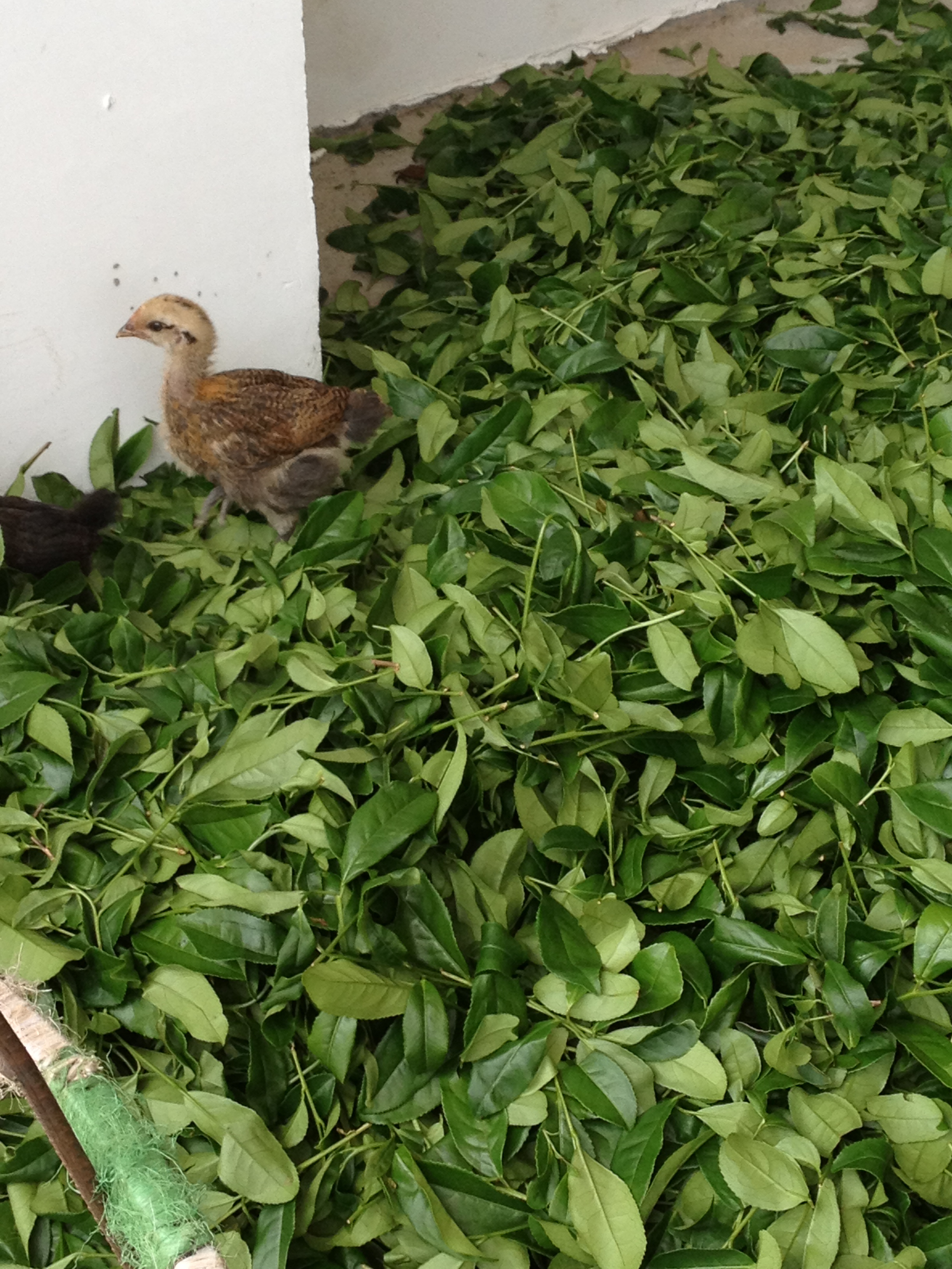 Later op de dag komt de zon weer met volle kracht op. Ze schijnt over de frisgroene velden en in een fabriekje waar we stoppen voor een bezoek hoppen drie jonge kuikens door de uitgestalde bladeren die liggen te drogen op lakens in de zon. Een gitzwarte haan loopt parmantig over het erf.