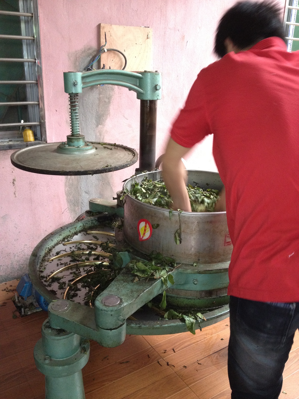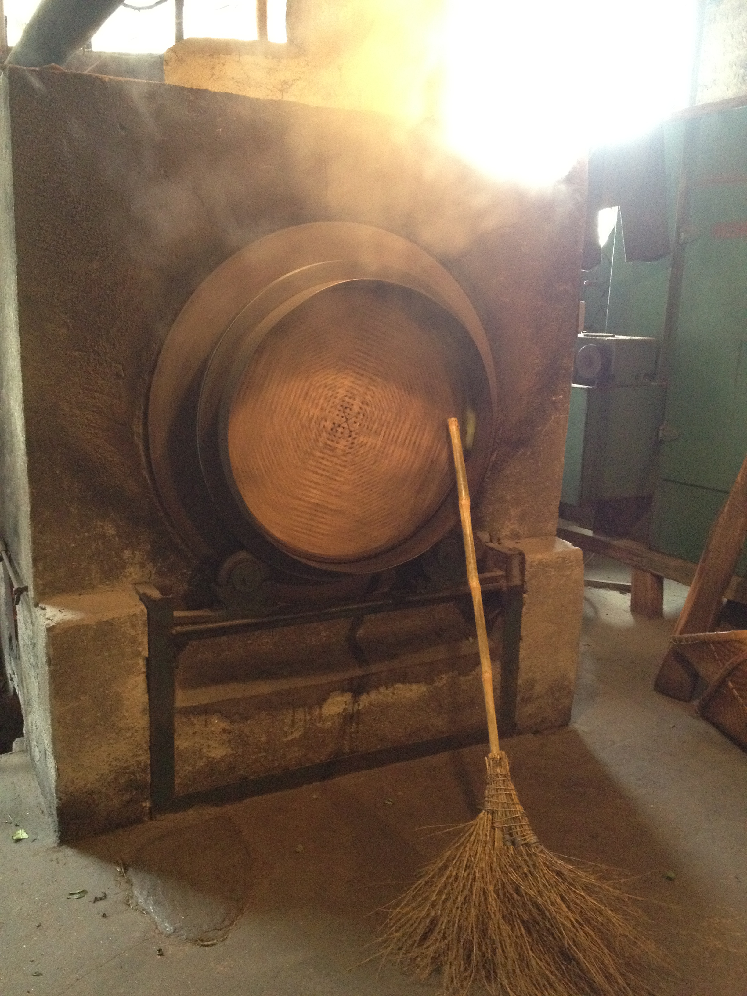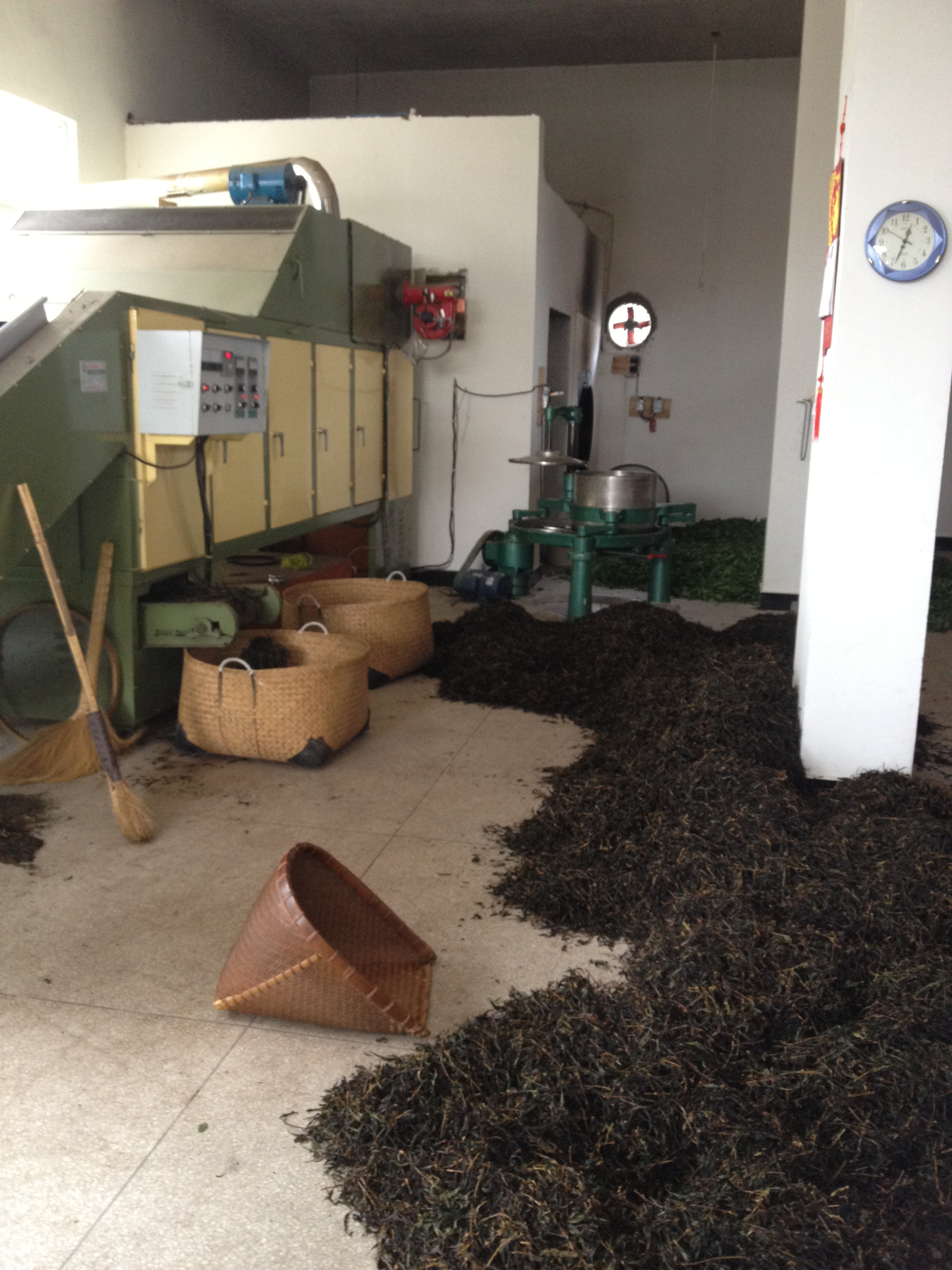 De productie is in volle gang, de ovens stomen en de machines ratelen. Op iedere vierkante meter ligt thee. Verse groene bladeren en bewerkte donkere bladeren. Het aroma vervult de ruimte en neemt volledig bezit van me. Er wordt hard gewerkt en hard gelachen. De werkers zien zwart van de hete ovens en vegen hun voorhoofd regelmatig af. De kamers zijn heet en vochtig en een sauna is hier niets bij vergeleken.