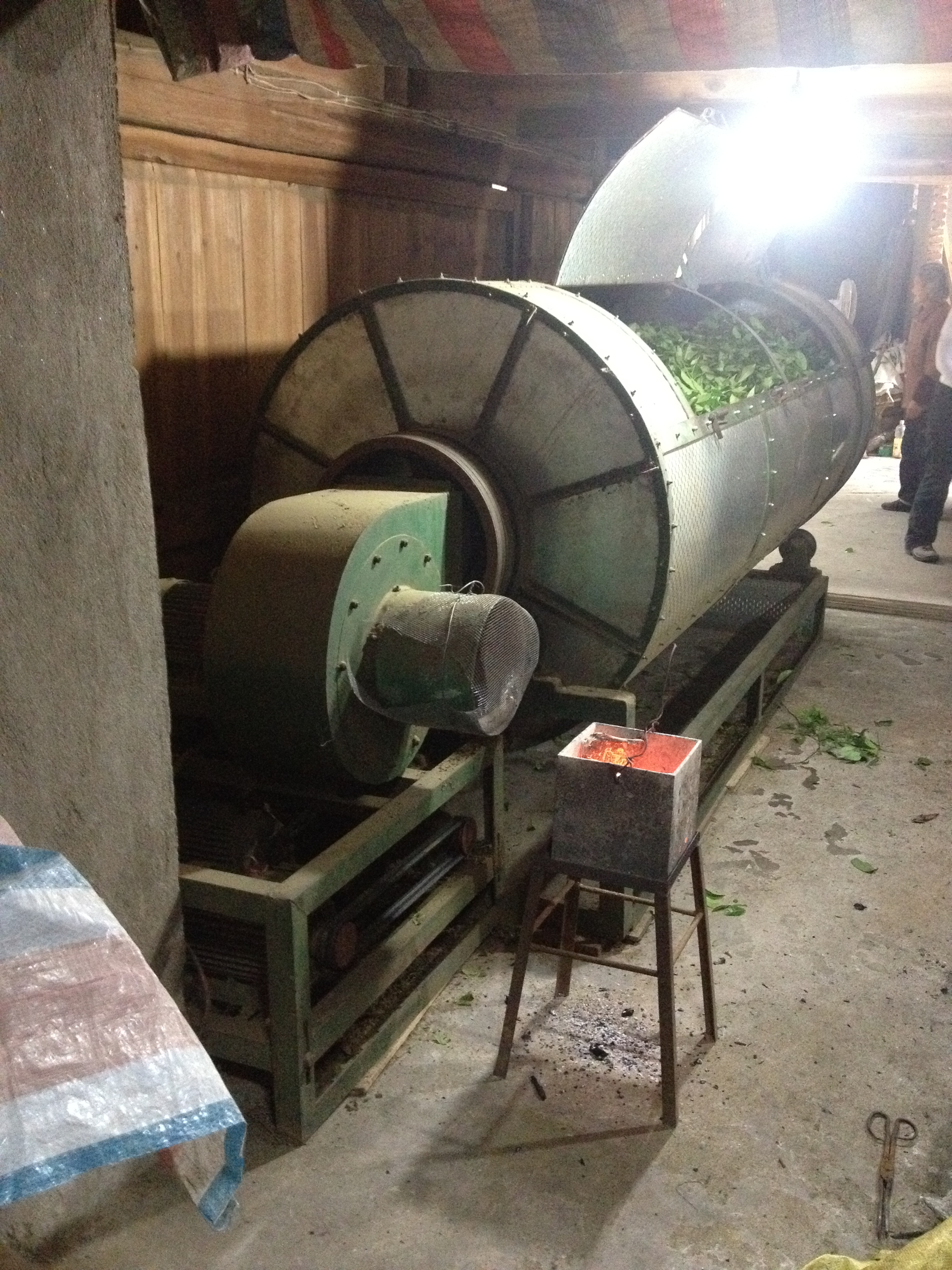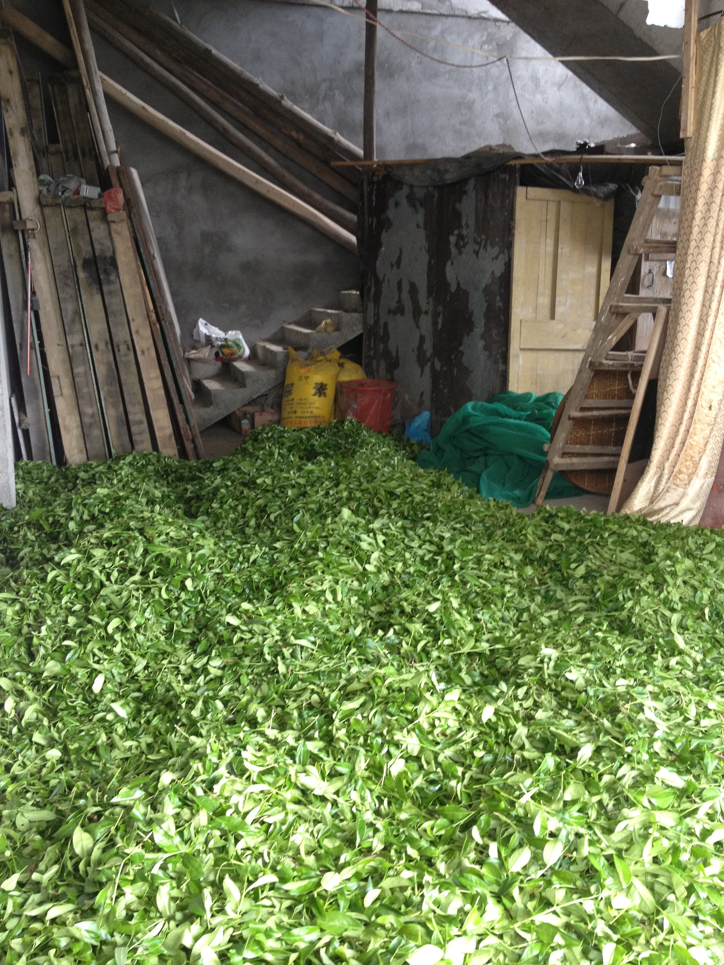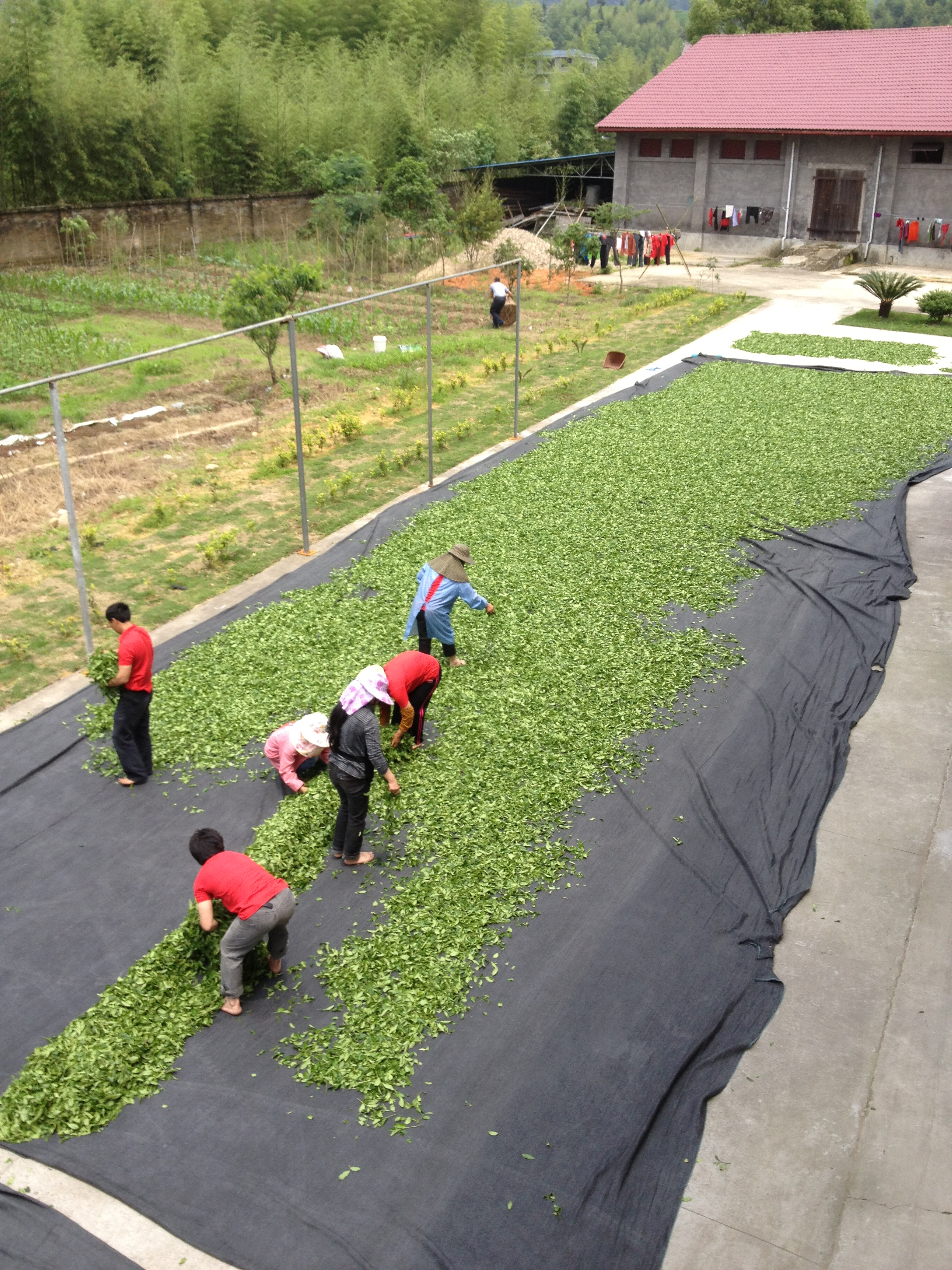 Na de pluk worden de blaadjes per brommer of vrachtwagen naar de fabriek gebracht, waar het bewerkingsproces kan beginnen. Er wordt gewerkt met man en macht. In kleine fabriekjes werkt men zelfs 24 uur per dag door en wisselen ploegen elkaar af. De blaadjes worden buiten in de zon gelegd op lakens op de grond.