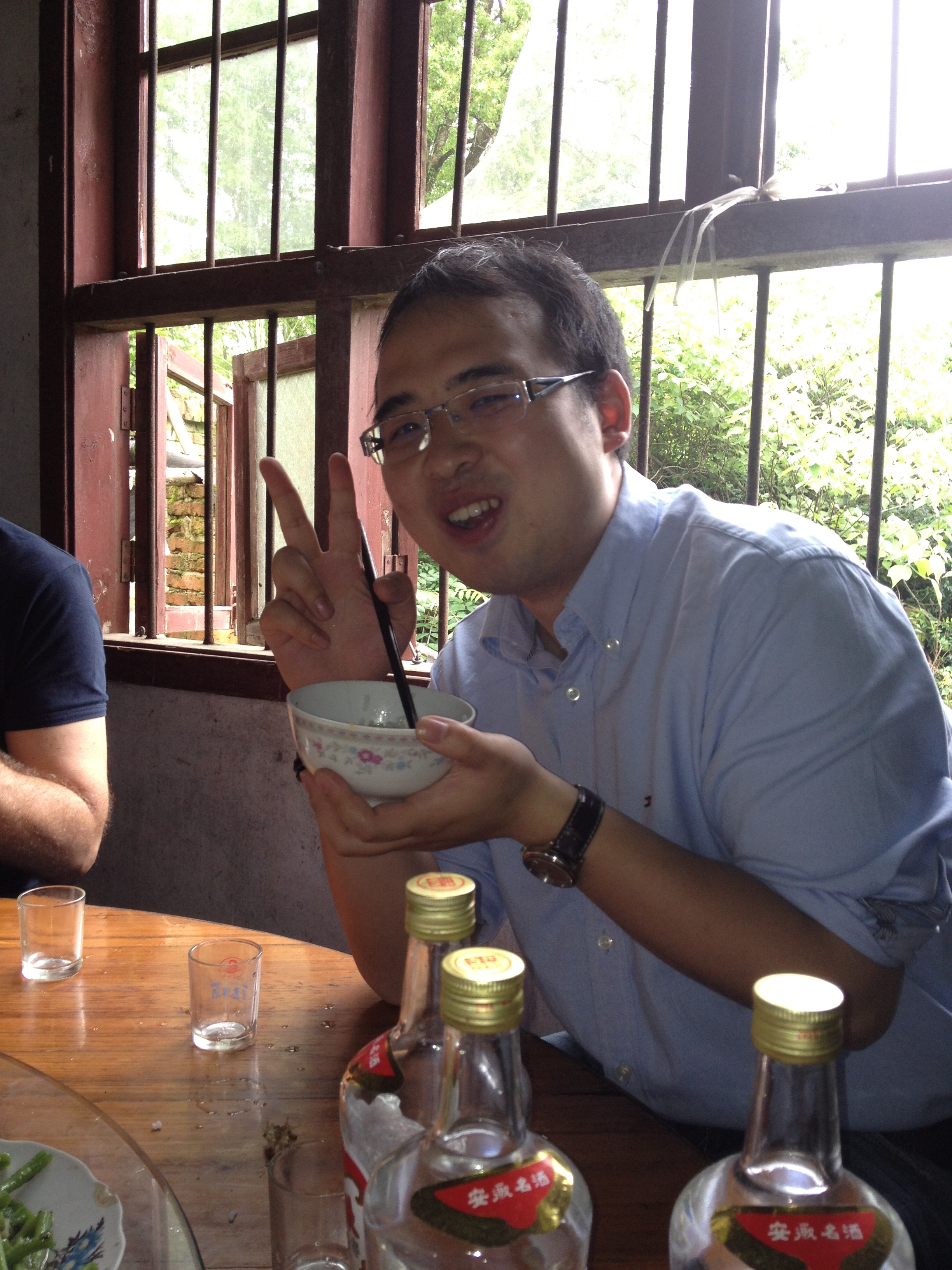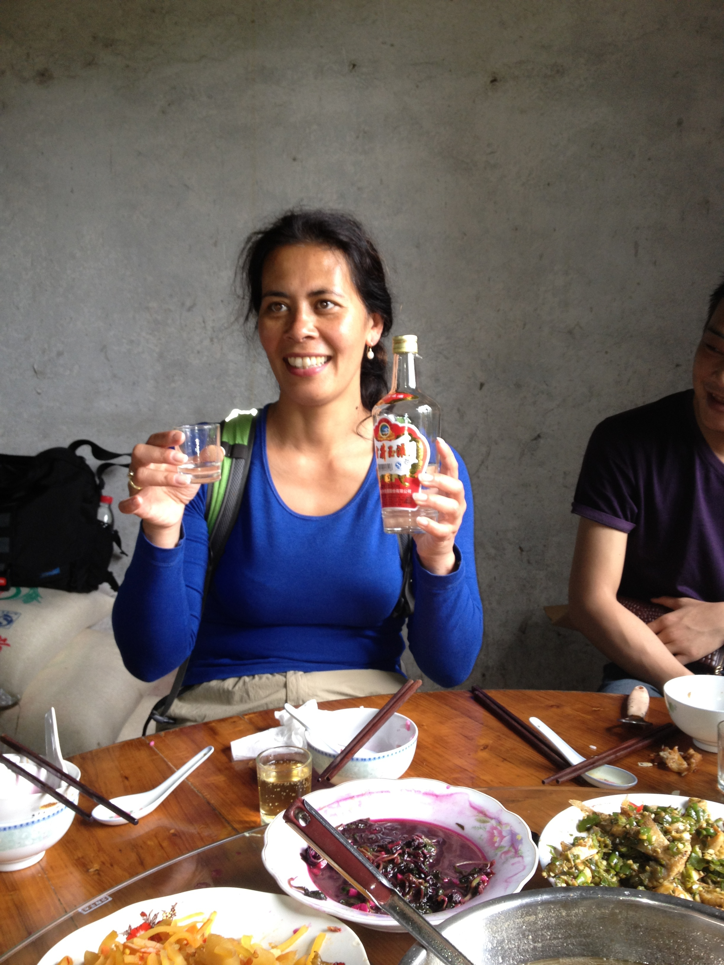 Yuxing nodigt ons uit voor de lunch en we nemen plaats aan een grote ronde tafel die vol staat met de heerlijkste gerechten. De gastvrijheid in deze familie kan niet op. Naast het eten staan drie flessen rijstwijn die volgens het opschrift van de fles maar liefst 38% alcohol bevat. Wij bedanken na een slok vriendelijk, maar kijken vol verbijstering naar de tafel naast ons, waar de werknemers lunchen en met gemak een halve fles leegdrinken tijdens de maaltijd. Ik vraag me af hoe ze straks nog kunnen werken… Na de lunch bedanken we deze bijzondere familie en rijden verder over het platteland.