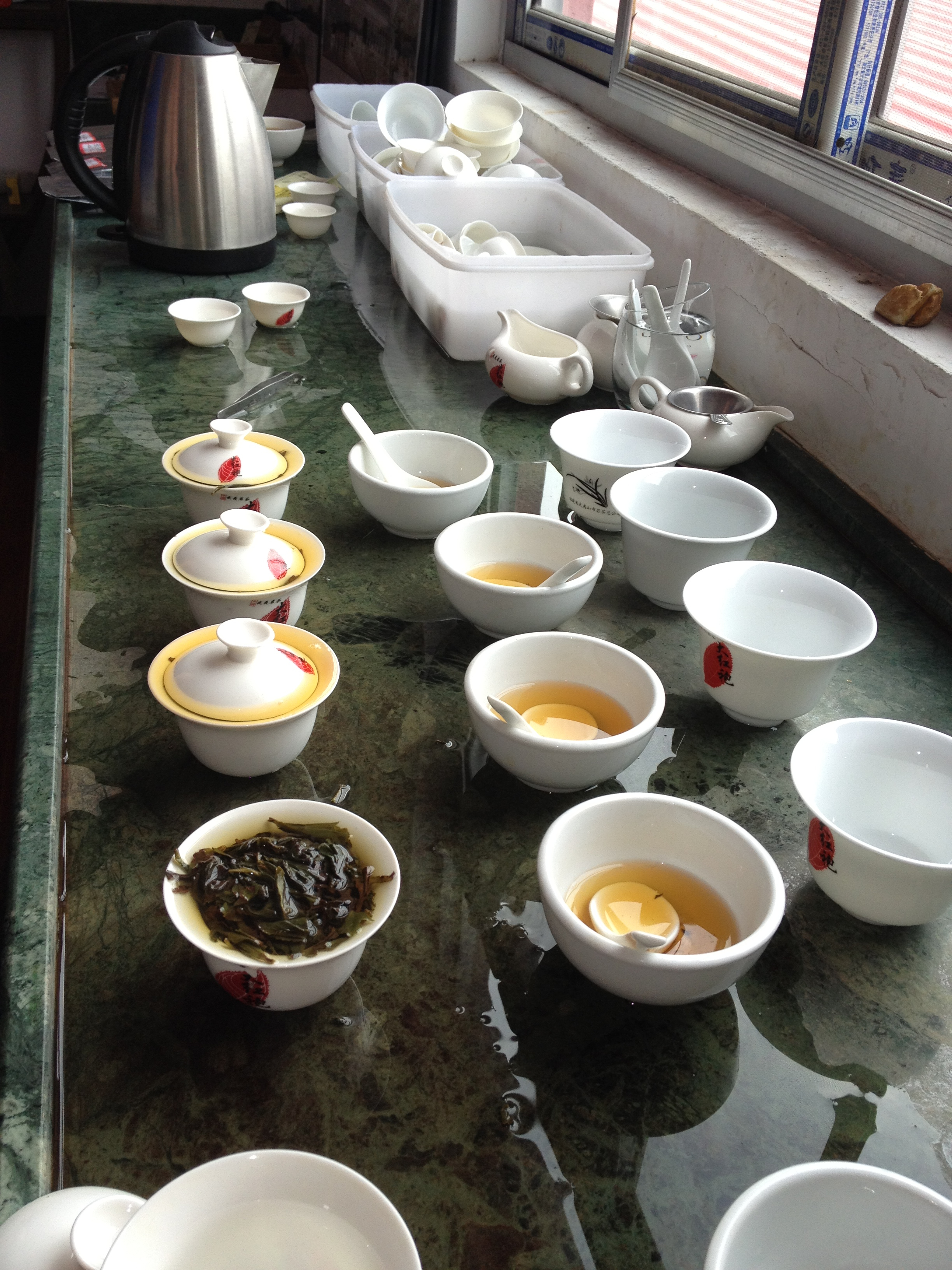 We ruiken aan het deksel van de Gaiwan (chinees theepotje) en nemen het warme aroma op van chocola. Met een lepel scheppen we de verschillende gradaties thee over uit de kommetjes in ons eigen kopje en slurpen met veel kabaal de thee naar binnen. De één is zoet en zacht, de ander wrang en astringent en weer een ander ruikt naar vanille.