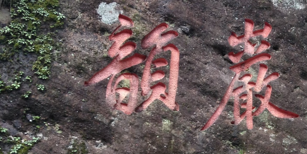 Rock Tea groeit tussen de rotsen of in ieder geval op grond die rijk is aan de mineralen uit de rots. Het zijn de mineralen in de grond die deze thee de speciale smaak en aroma geven. Hier groeien struiken van 20 jaar oud en zelfs nog oudere struiken van 30 en 40 jaar oud, de groene lange ouderdomsharen hangend aan de onderkant van de struik. We zien gedichten met rode verf gekerfd in de wand van de rotsen. Het zijn gedichten geschreven in de Songdynastie, ongeveer 1.000 jaar geleden. Lang staan we stil bij dit bijzondere plaatje.