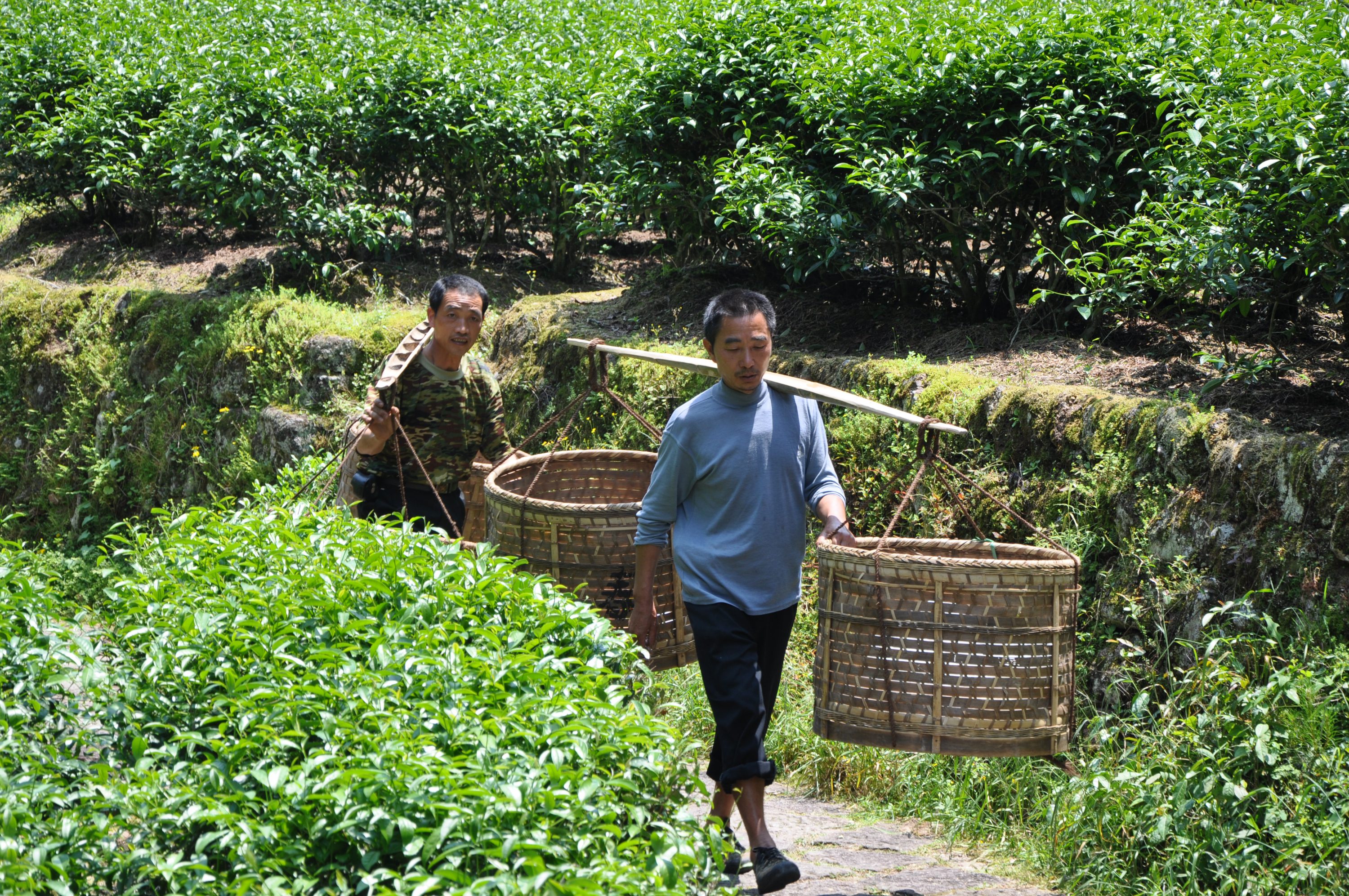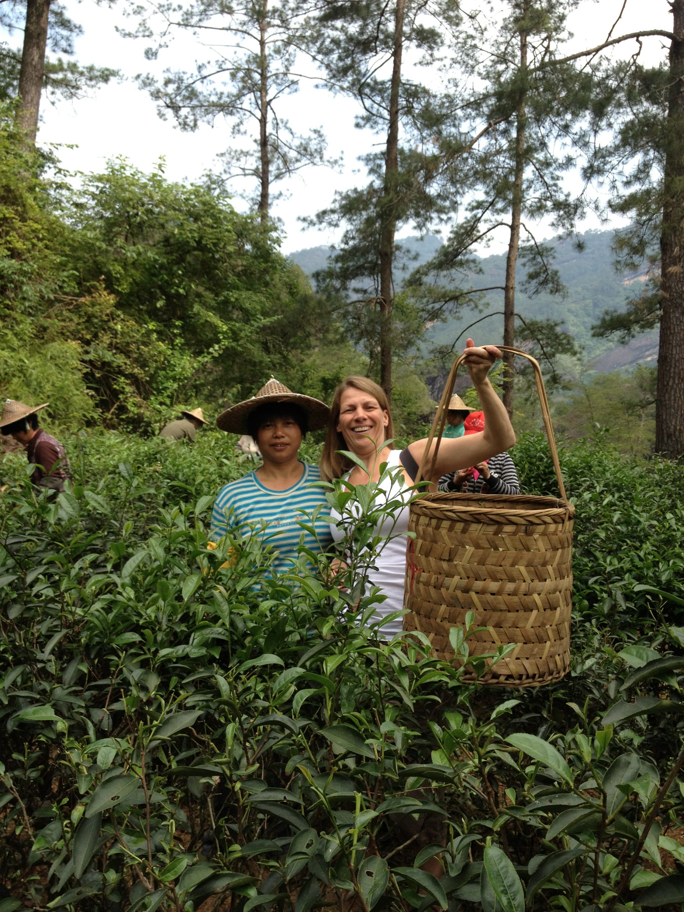 Thee van de Wuyi Mountains noemt men Wuyi Rock Tea. Het is een naam, maar minstens zoveel een aanduiding voor thee die van grote waarde is. Deze thee groeit op grond die vol zit met mineralen van de rots. En overal, zover het oog reikt, zie ik rijen ronde struiken, in rechte rijen naast elkaar, maar ook los en eigenwijs op de rotsen en op ieder plekje waar het groeien kan. We wandelen voor uren, klimmen en rusten. De machtige hoge rotsen torenen boven ons uit en in vele kleuren grijs en rood koesteren zij de bijzondere plantjes die zij meedragen op hun zij.