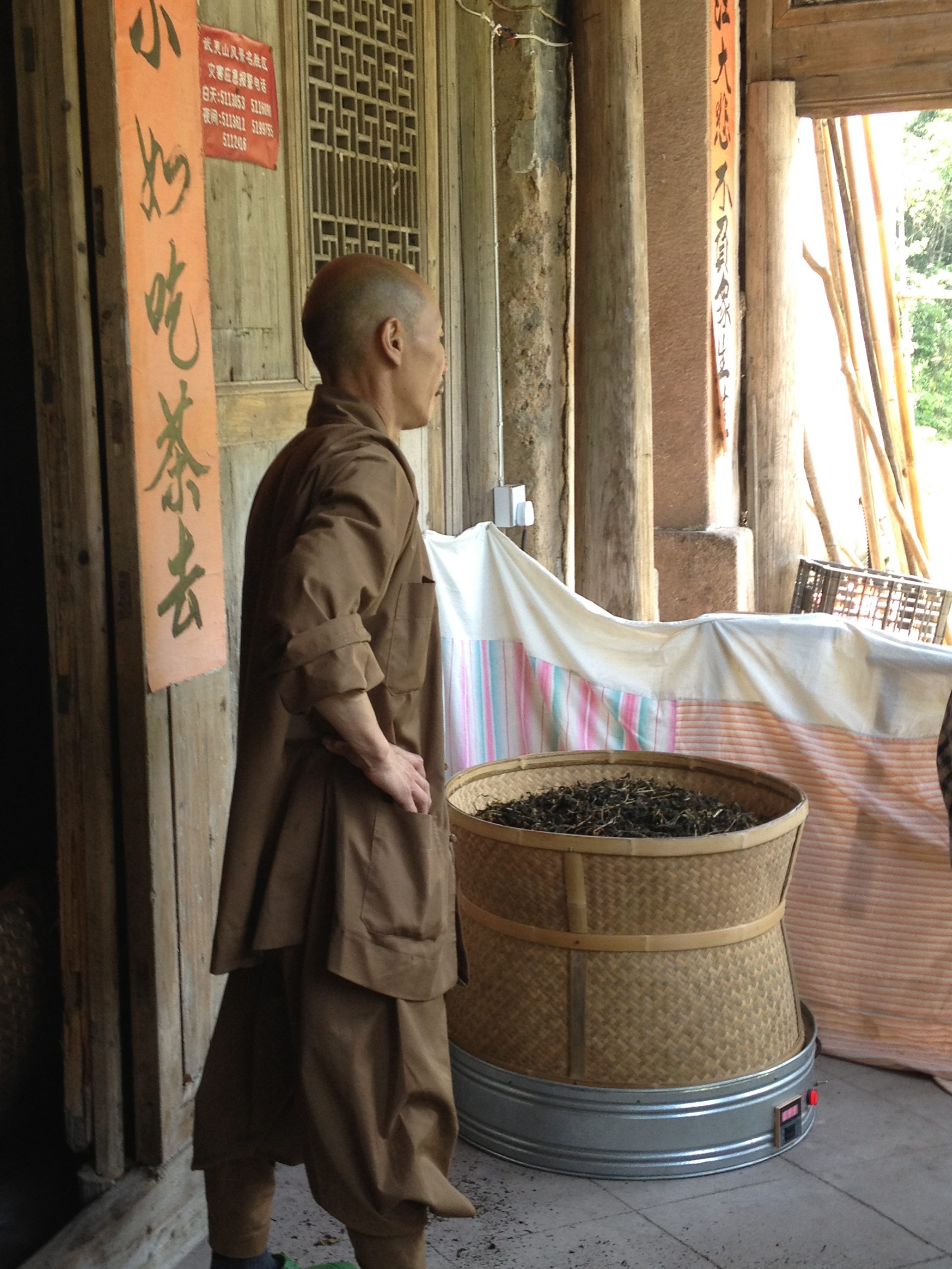 Ik geniet van het machtige uitzicht, ver van de wereld die ik enkele uren geleden achter me gelaten heb. Op het terras liggen theebladeren te drogen en een grote rieten mand staat boven op een vuurtje. In de mand liggen theebladeren. Ze worden gebakken, ter verbetering van de smaak. Een monnik komt naar buiten en schudt de bladeren in de mand. Een kip rent met snelle pasjes voorbij. In de verte kraait een haan. De waterval op de achtergrond raast en blaast. De tijd staat stil.