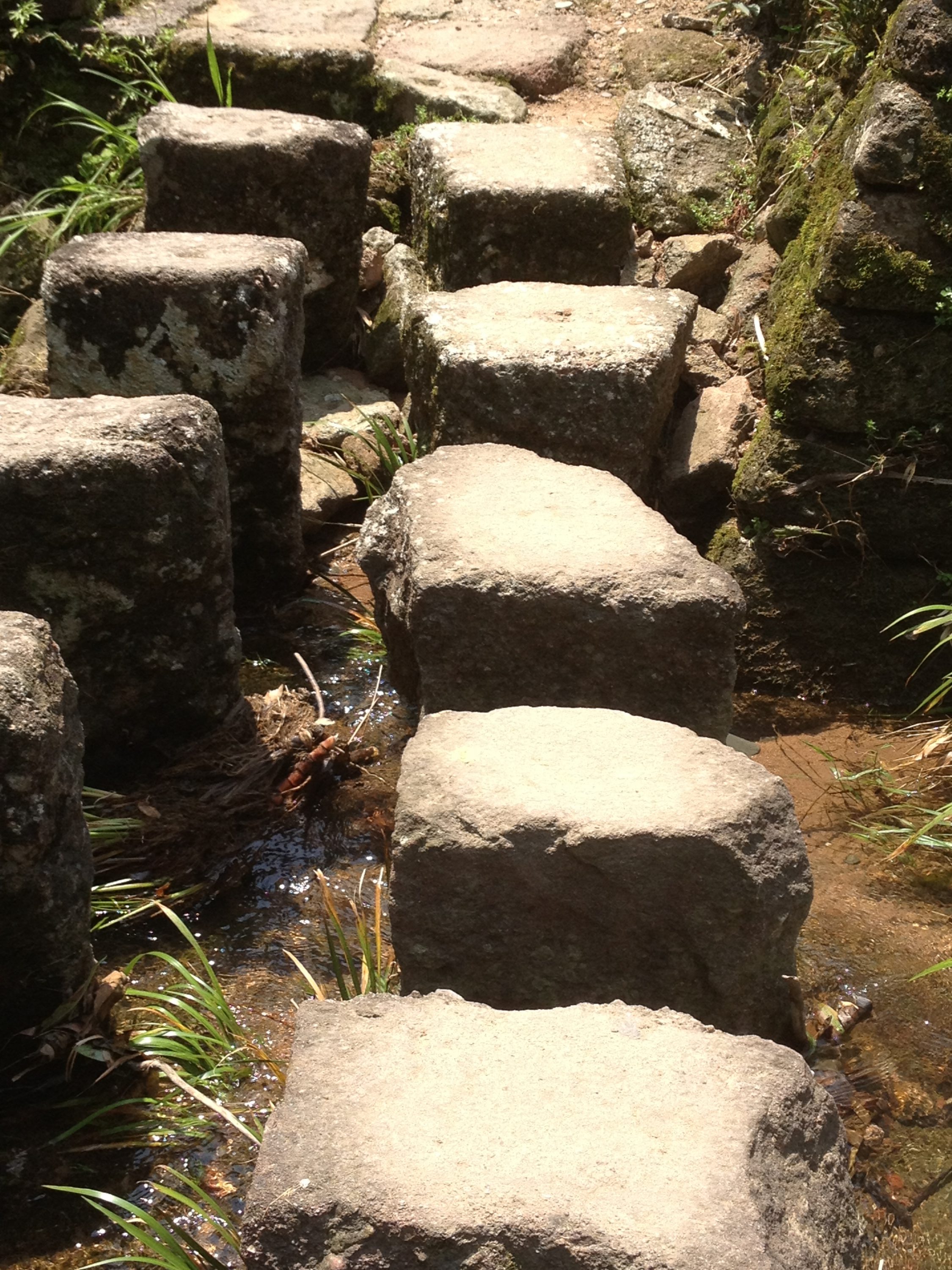 We vervolgen onze wandeling en snuiven de geur op van verse blaadjes, hemelhoge watervallen, trotse bloemen en pure steen. Tengere mannen gebukt onder zware theezakken aan een bamboestok, balancerend op de smalle schouders, passeren ons op de steile trappen naar de top.