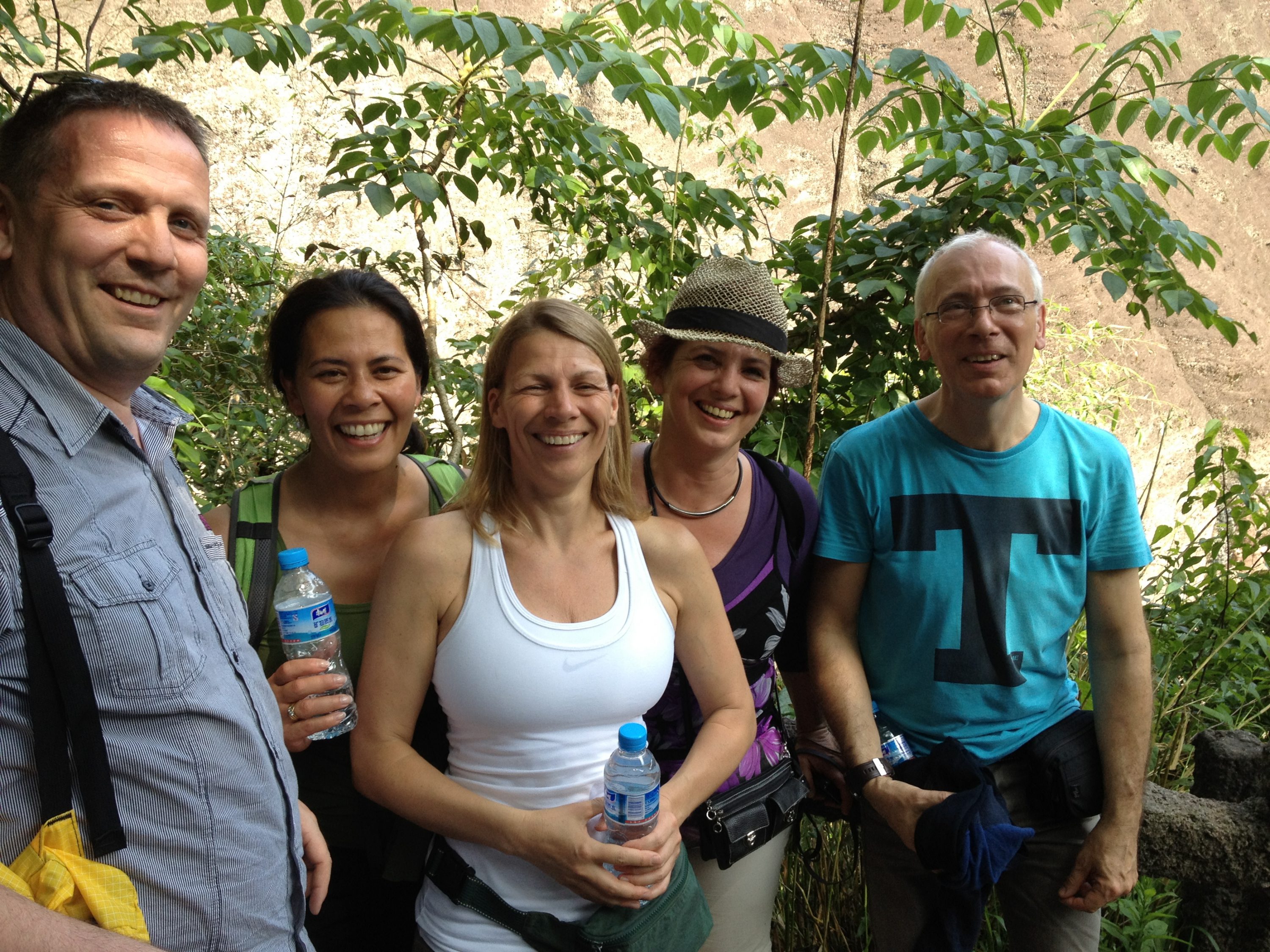 Al snel wordt het stiller en zijn de laatste mensen verdwenen. Hier komen niet veel mensen. Theeplanten groeien hier in overvloed, de ene varieteit naast de andere. De zachte kleine blaadjes staan dapper in de zon en hoog boven ons vinden theeplanten hun weg langs de steile helling van de rots.