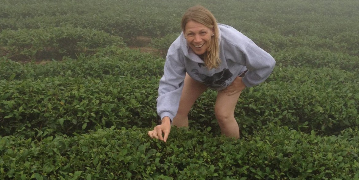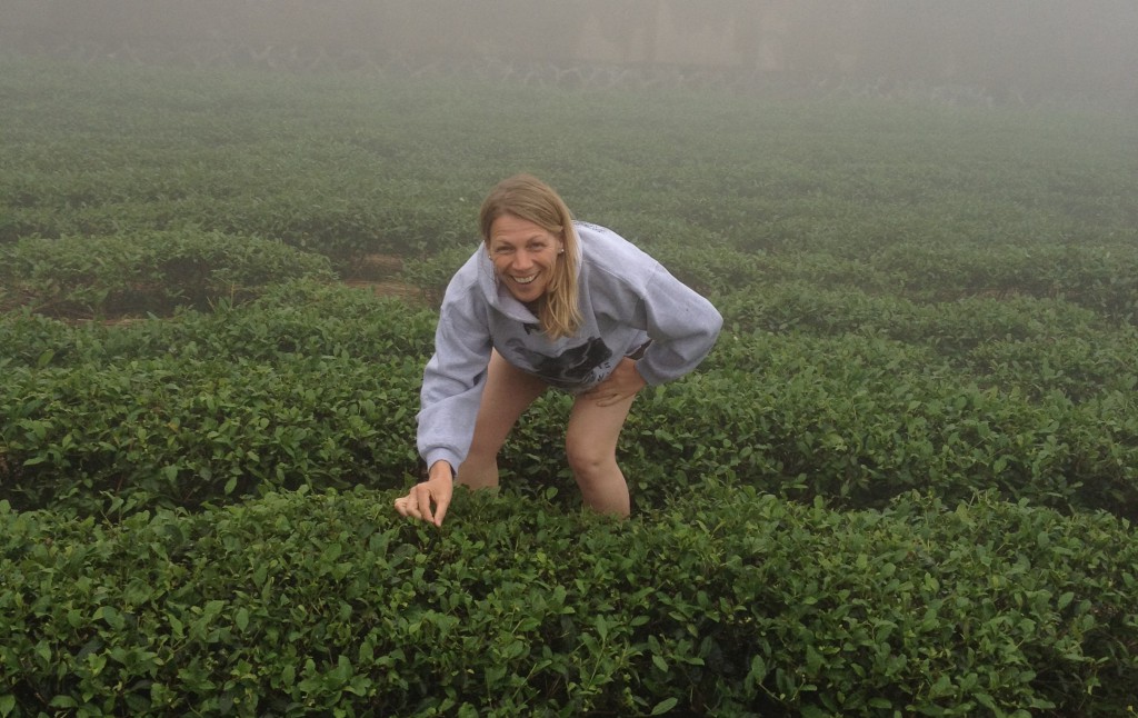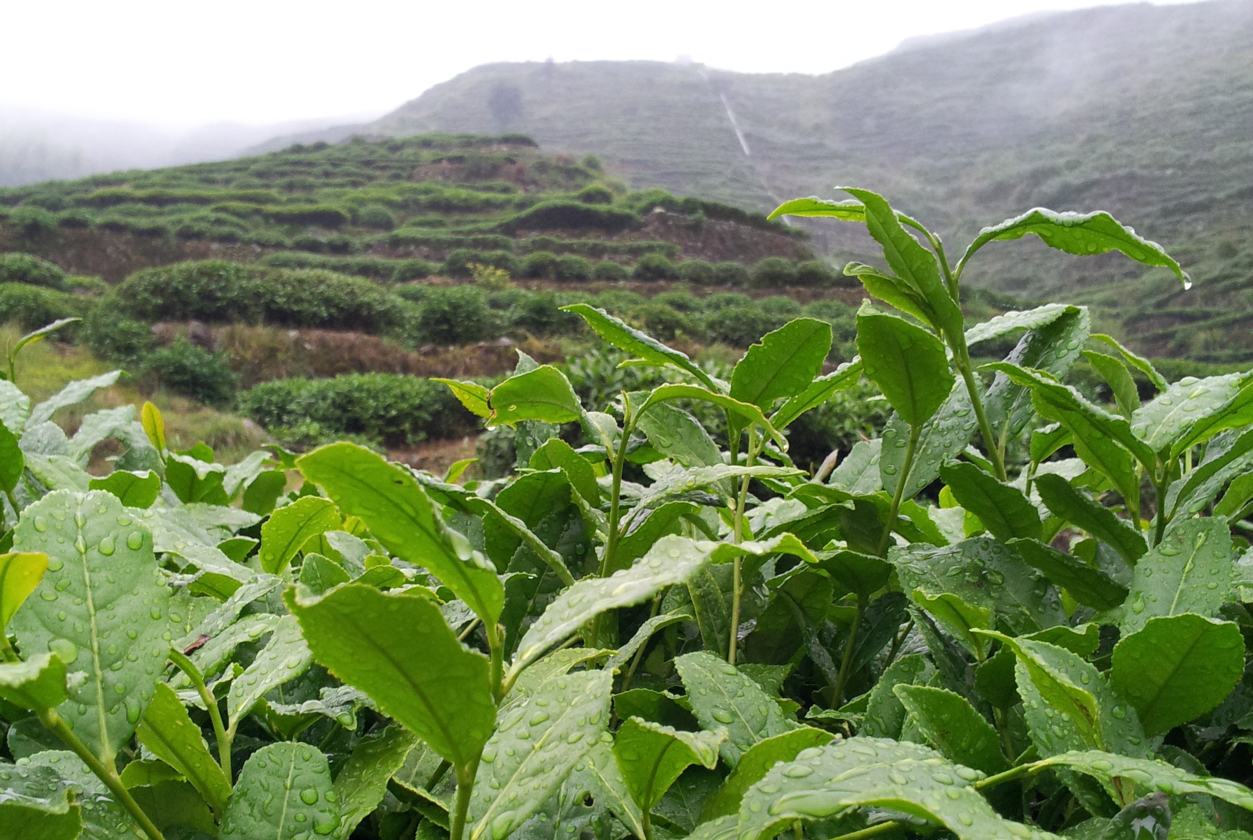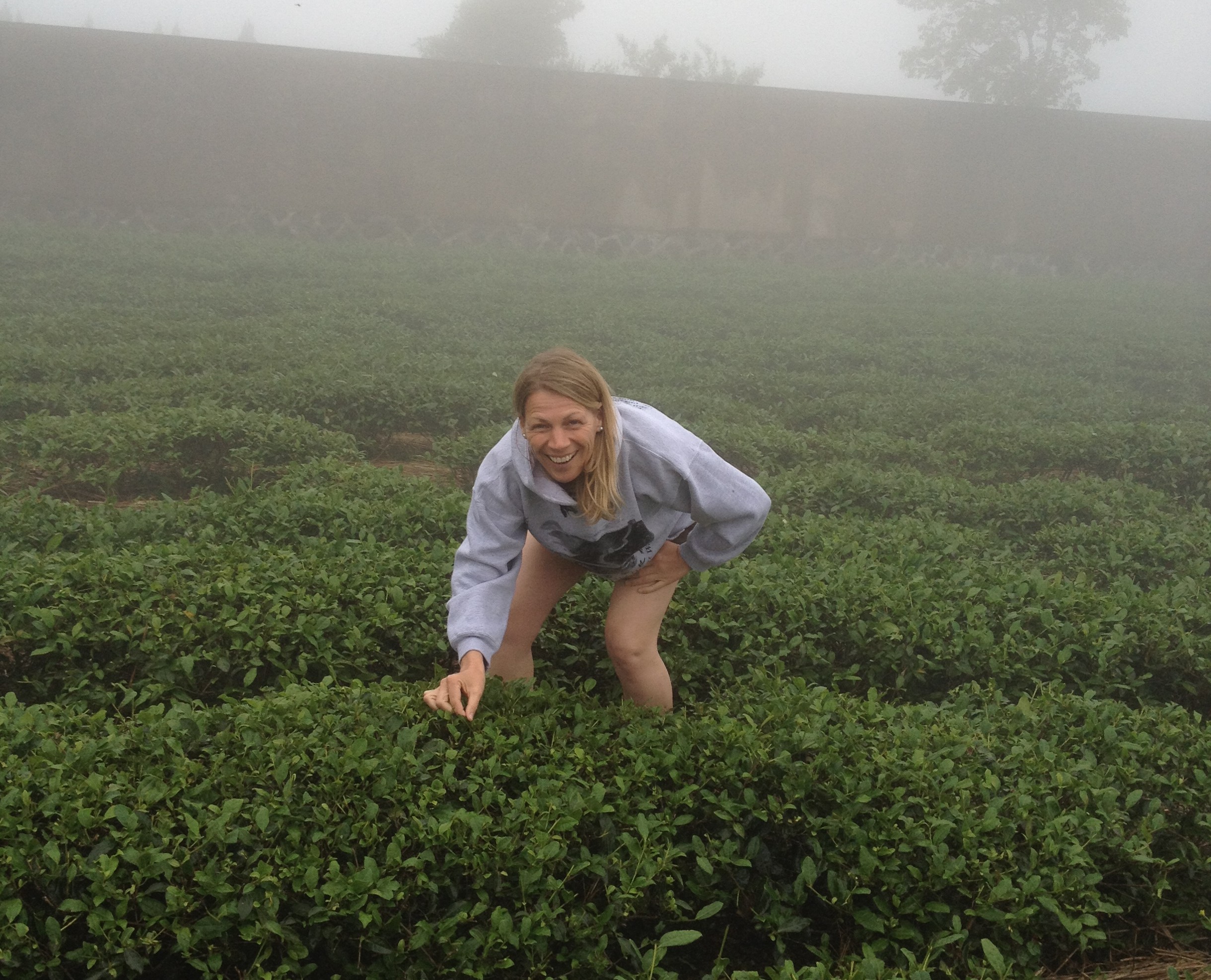 Het is een magisch moment. Afgesnoeide struiken met kleine blaadjes staan als kleine ronde bolletjes in rijen naast elkaar. Rij na rij, zij aan zij, heuvel na heuvel. Ik zie ze overal. Beneden in het dal, boven op de toppen van de berg, dwars door de rijstvelden en eigenwijs slingerend tussen de enkele huizen door. Een dikke laag mist hangt boven de planten en veroorzaakt een mysterieuze gloed. Ik kruip door de tuin en pluk mijn eerste blad: two leaves and a bud. Ik ben verrukt en neem de tuinen goed in me op. Ik realiseer me dat het nog wel eens zou kunnen tegenvallen. Het zou kunnen blijven regenen…