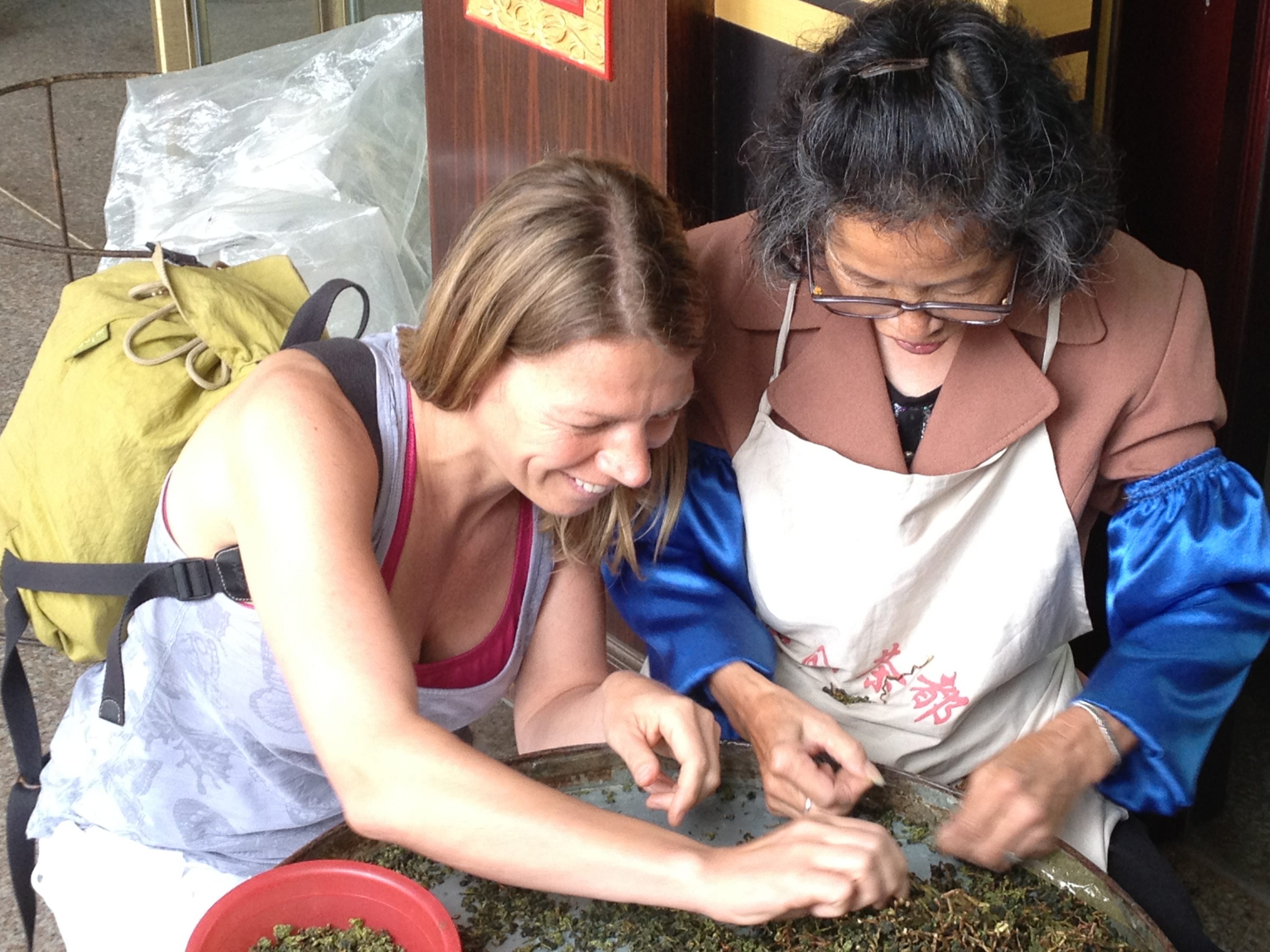 We passeren het ene na het andere winkeltje waar mannen en vrouwen op krukjes gezeten thee, gelegen op grote platte rieten manden, sorteren. Het sorteren van thee is een enorm karwei en hele dorpen worden aan het werk gezet om de klus te klaren. Ieder huis, iedere straat, iedere stoep is in gebruik genomen om de bewerkte thee te sorteren, wat betekent dat de blaadjes gescheiden worden van de takjes en de steeltjes. De blaadjes worden verkocht als thee. De steeltjes gaan naar de restaurants waar goedkope thee van gemaakt wordt als gratis drank voor de gasten. Daarnaast worden de steeltjes gebruikt voor het vullen van kussens. De ene na de andere theewinkel glijdt voorbij; mensen zitten gemoedelijk bij elkaar en drinken thee.