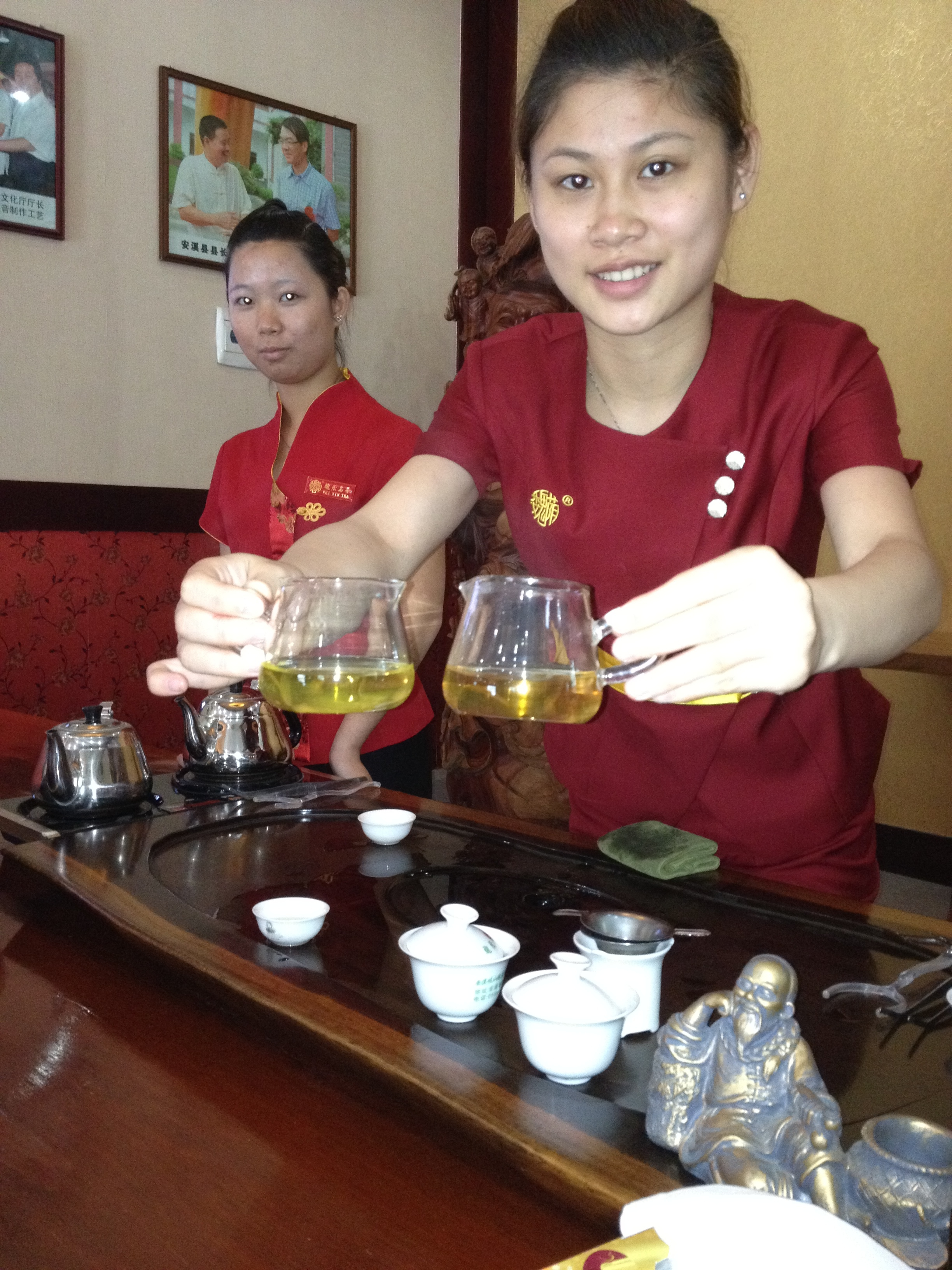 In Anxi bezoeken we het Weiyin Centrum. De Weiyin-familie gaat 9 generaties terug en men zegt dat de oude eerste meneer Weiyin de eerste Tie Guan Yin-plant heeft gevonden in Xiping Village, niet ver hier vandaan. Het is een Tie Guan Yin van hoge kwaliteit met een lange historie. We worden ontvangen in een ruime lichte showroom waar tengere fragiele meisjes ons Tie Guan Yin laten proeven van verschillende gradaties. Wat deze meisjes nog eens extra charmant maakt, is hun vastbeslotenheid deze buitenlanders, die ze anders nooit zien, zo goed mogelijk van dienst te zijn. Met een draaiboek in de hand, waarin gescheven staat welke zinnen uit te spreken – hello, how are you? – , leiden ze ons door de theeceremony heen.