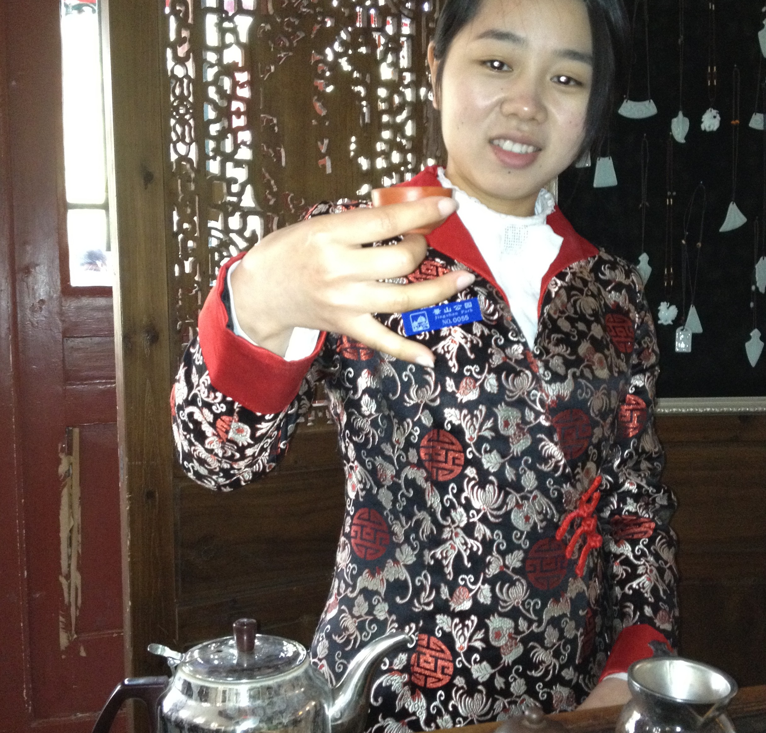In het theehuis worden we uitgenodigd voor een theeceremony. Het meisje praat ons de oren van het hoofd en we proeven een Pu’ehr, een Ginseng Oolong, een Jasmijnthee en een Lychee thee. We leren weer bij. Het kleine kopje dat standaard gebruikt wordt voor de gongfucha (chinese manier van theedrinken) wordt vastgehouden met drie vingers. De andere twee vingers (wijsvinger en pink) steken in het geval van een vrouw recht vooruit, als ‘de staart van de phoenix’, elegant en vrouwelijk. De man vouwt de twee vingers naar binnen in de handpalm, als’ de draak’, voor kracht en mannelijkheid. Het eerste kopje drink je in 3 sips leeg: voor good luck, happiness and a long life. Het Chinese karakter voor smaak/taste laat deze drie drupels ook zien in de vorm van drie kleine vierkantjes.